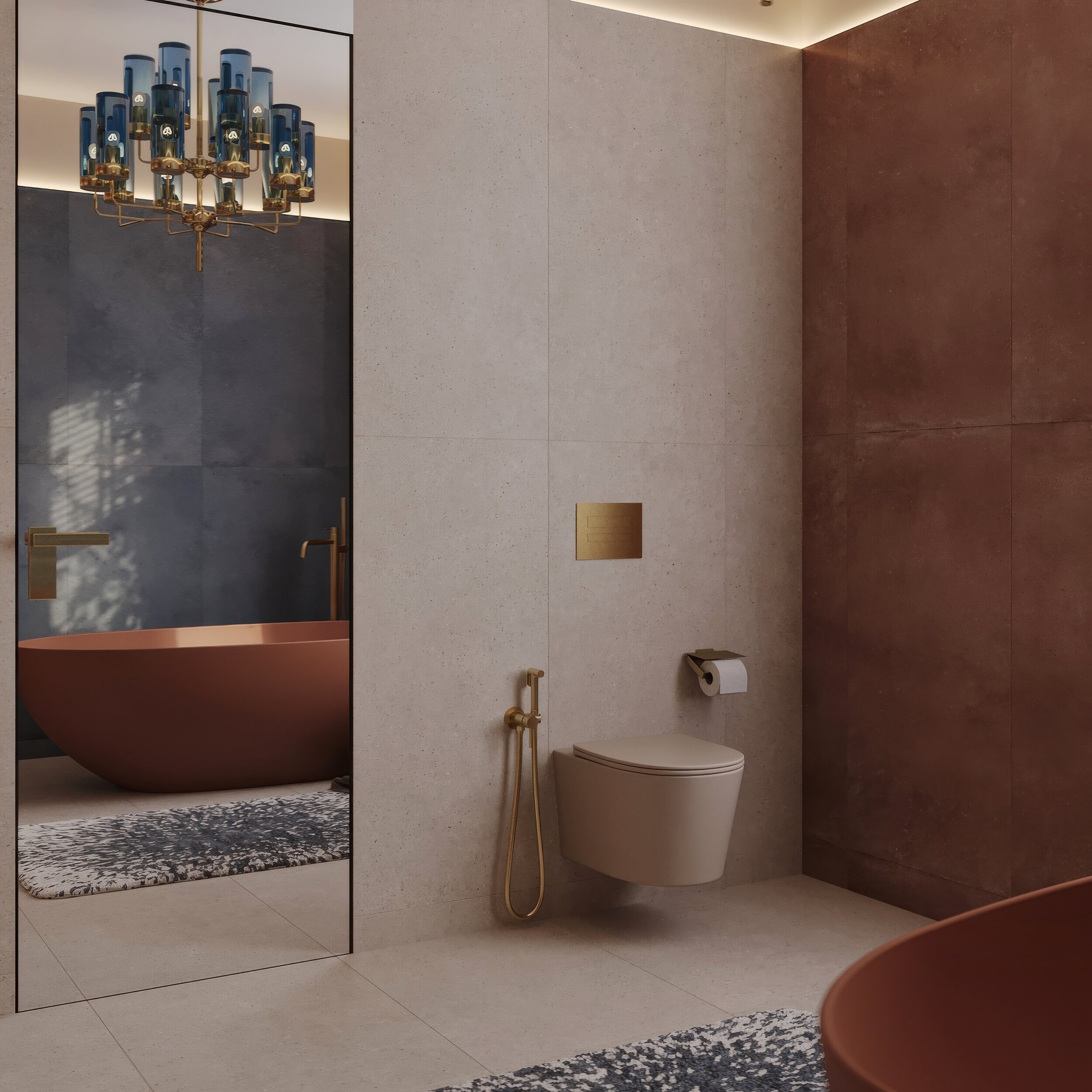 Мастер-санузел для молодой пары, стремящейся к смелым и нестандартным решениям. Основной концепцией стало сочетание двух ярких цветов, что было реализовано с помощью сантехники от Аквамира: отдельно стоящей ванны глубокого терракотового оттенка и выразительной синей раковины. Контрастная палитра гармонично дополняется бежевым унитазом, создавая сбалансированный цветовой ансамбль. Для усиления эффекта плитка была подобрана в тон сантехники, а акцентные элементы — смесители, кнопка смыва, напольный смеситель для ванны — выполнены в элегантном золотом цвете. Такое сочетание материалов и оттенков подчеркивает современный стиль интерьера, придавая пространству индивидуальность и глубину.